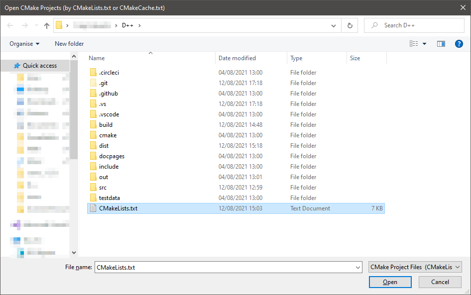 3. From within Visual Studio 2019, click the "File" menu, choose "Open" then "CMake", and select the CMakeLists.txt within the project folder